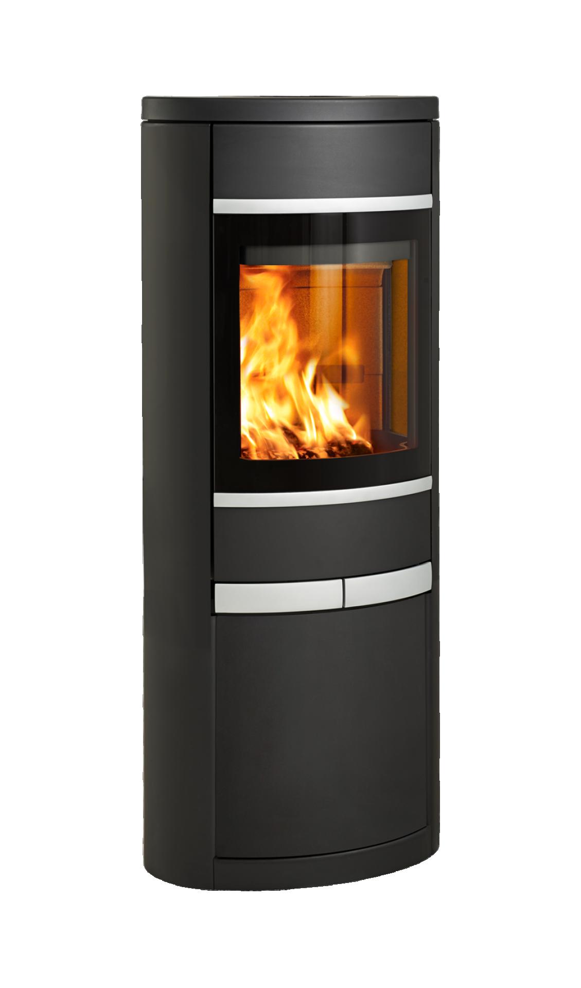 Son piétement classique prolonge naturellement sa chambre de combustion elliptique, formant une ligne verticale équilibrée et affirmée. Les parements longs en acier noir confèrent à l’ensemble une prestance discrète, idéale pour un intérieur épuré. L’aluminium brossé utilisé pour la poignée et les baguettes donne du relief aux finitions et offre un agréable contraste de textures.
